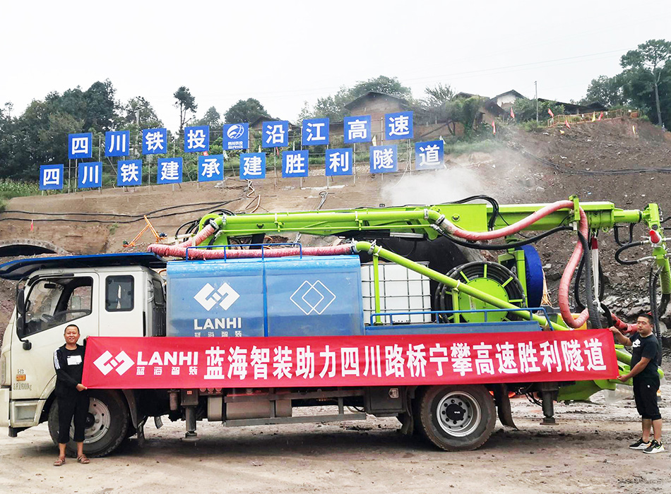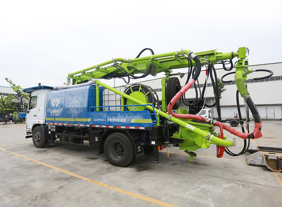 LCHP40D車(chē)載濕噴機(jī)械手采用汽車(chē)底盤(pán),是一款綜合國(guó)內(nèi)隧道初支混凝土噴錨工藝及施工情況研發(fā)升 級(jí)的一款專(zhuān)用設(shè)備。該設(shè)備具有噴射方量大(最大噴射方量40m3/h)、不易堵管、回彈低、機(jī)動(dòng)性好、性能 穩(wěn)定可靠等特點(diǎn)。解決了傳統(tǒng)小型濕噴機(jī)不能滿(mǎn)足大、長(zhǎng)隧道混凝土噴射的不足,提高了施工效率,減少了 混凝土消耗量,切實(shí)保障施工質(zhì)量。